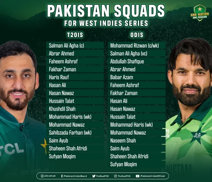 ویسٹ انڈیز کے خلاف ٹی ٹوئنٹی سیریز کے لیے 15 رکنی قومی اسکواڈ میں سلمان علی آغا (کپتان)، ابرار احمد، فہیم اشرف، فخر زمان، حارث رؤف، حسن علی، حسن نواز اور حسین طلعت شامل ہیں۔